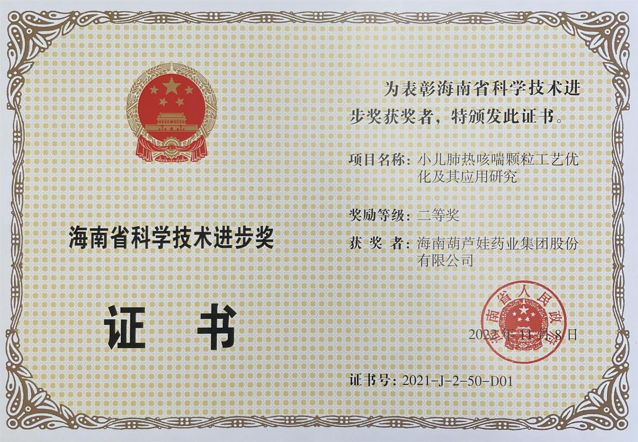 为此,小儿肺热咳喘颗粒的制备方法获得了第二十一届中国专利优秀奖(2019年),专利申请号:ZL201010134951,此次作为专利技术的应用,获得了2021年度海南省科学技术进步奖二等奖。在此之前,AG贵宾会牌小儿肺热咳喘颗粒还多次被授予“临床价值中成药品牌”、“中国连锁药店最具合作价值单品”,荣登“中国医药品牌榜”。